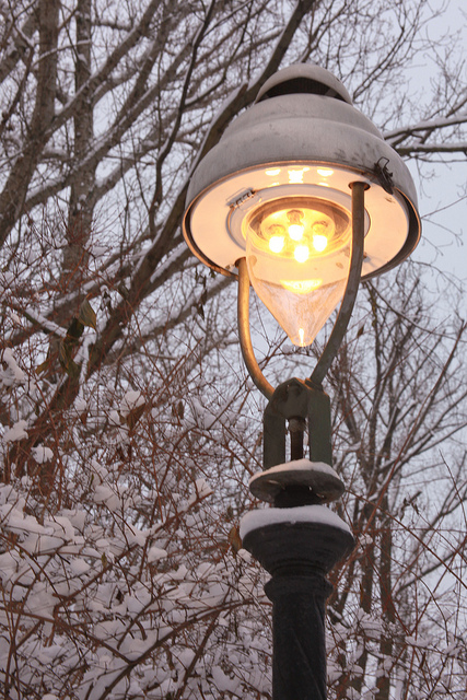 Adam then points out that gas lamps give off a warmer, more amber color. Rasto agrees and goes in for a closer look, stepping on top of a snow-covered bicycle to hoist himself halfway up the lamppost. He shakes the pole and watches the lamp-light flicker, his eyes lighting up with this brightness of his discovery.