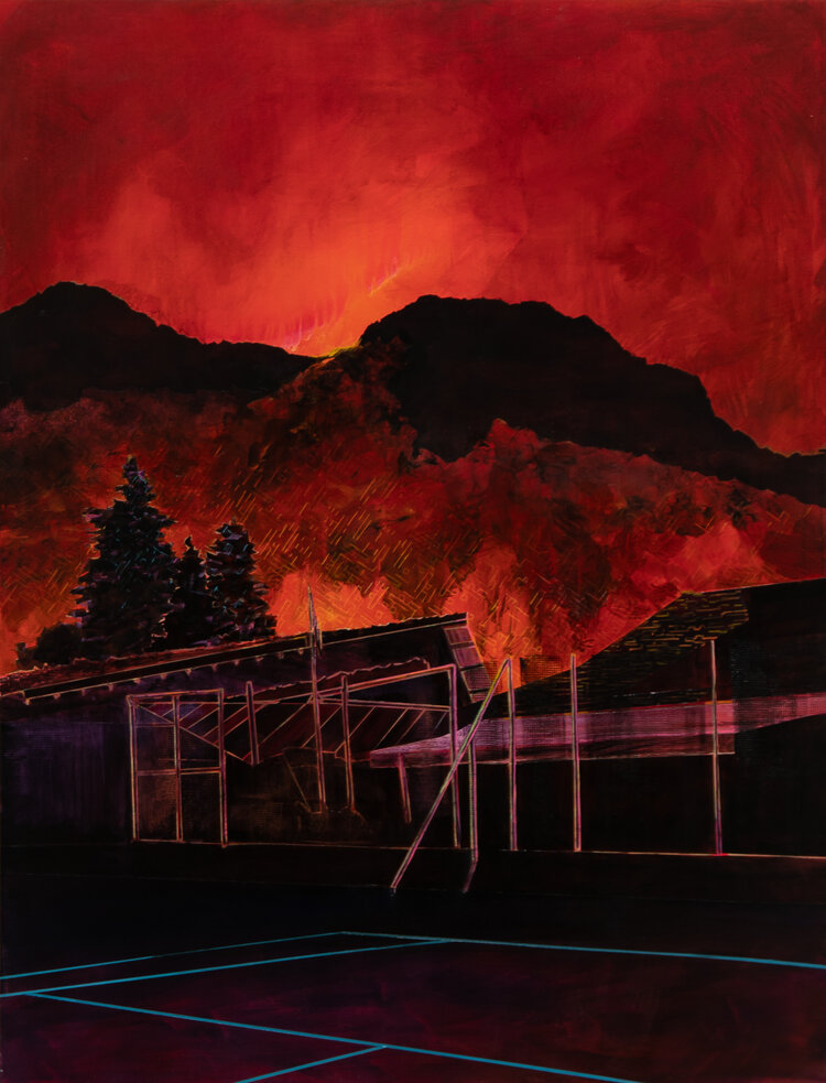 Rob’s paintings. Much will be made of the subject matter, the fires. That’s fine. It’s hard not to feel the heat emanating from those canvases, the same heat curdling the headlines. But these paintings are evocative of the times beyond the contents. The sight of fires and damage is not just depicted in the paintings, it’s a component of the technique. On first glance the pool is swiped with painterly’ “noise,” a la Richter, but the impression it leaves on the viewer is that of a scar. For someone who has seen Rob paint these scenes for nearly a decade, it’s jarring, like seeing an old friend or family member emerge from a health crisis with a from-this-point-on-distinguishing scar. It’s how they look now. How we all look in 2020, and certainly after. So hard to believe we’re still in it, but not in the small room where Rob’s paintings are displayed. It’s the most intimate public space I’ve been in in months. If Rob’s pieces have been critiqued as a reflection of privilege, a claim that may or may not have merit or be immaterial, he also shows that these objects are not immune to erosion, decay, or even complete destruction. Rob’s paintings have always existed in their own plane, so it’s striking to see them altered, to see that this plane is also subject to the same rules of physics as our real-world landmarks. Not because it’s such a foreign experience, but because it’s so recognizable. We are all scarred by this year, we recognize our own crises and traumas in these pigments. The artist depicts but does not judge, our damage is safely contained within the contemplation of each scene, which in other circumstances or conditions might be beautiful. But that is not the timeline we were given. So here we are, huddled apart for warmth, scared and shaken but also beginning to suspect that we can survive/”overlive” the gray months as long as fireworks of color like these adorn the walls of the gallery, and even in our darkest moments, continue to exist and shine and even thrive.